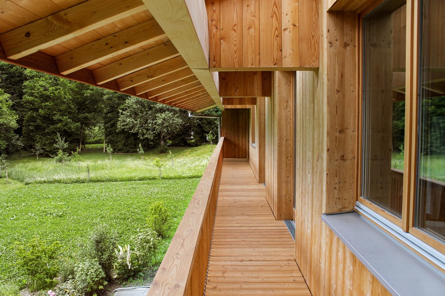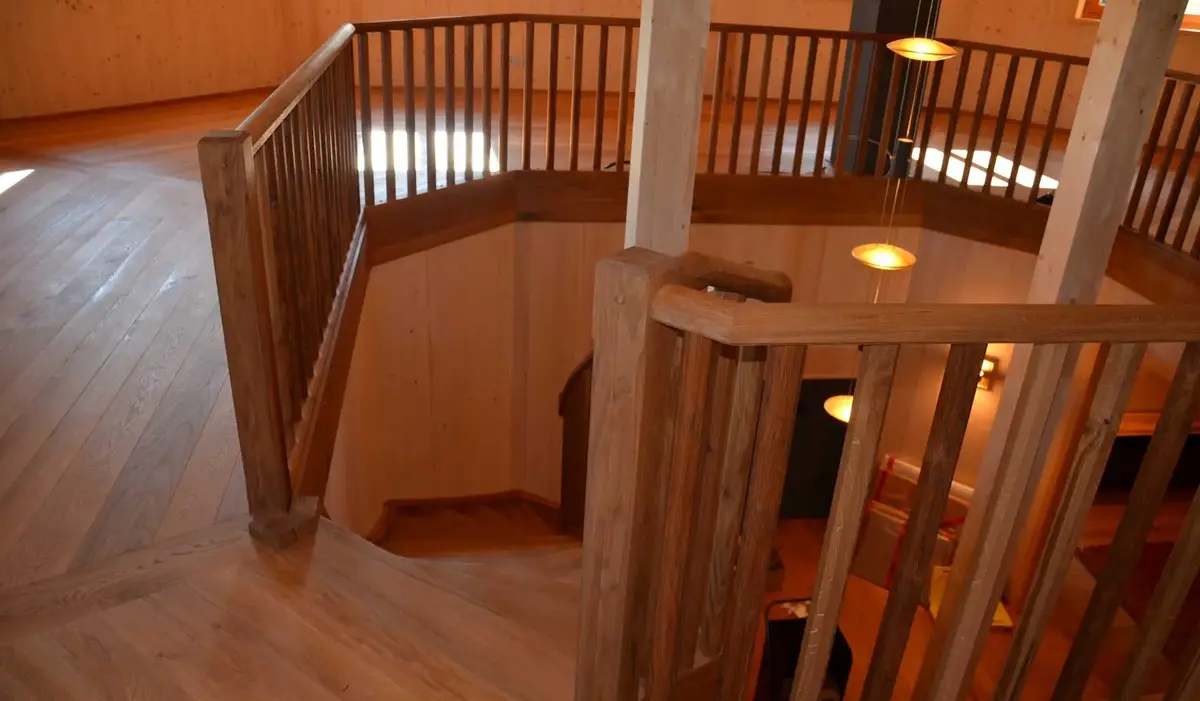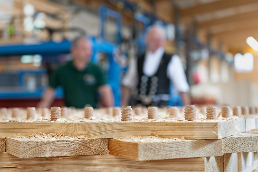Verbunden werden die einzelnen Lagen mit speziellen Buchenschrauben. Sie halten die Elemente dauerhaft zusammen und ermöglichen eine durchgängige Holzbauweise. Auf metallische Verbindungsmittel oder chemische Zusätze wird bewusst verzichtet. Dank einer speziellen Montagetechnik bleiben die Verbindungselemente auf den Innenseiten unsichtbar – sichtbar bleibt die natürliche Oberfläche des Holzes.