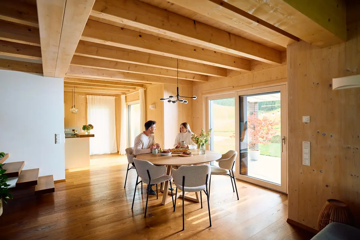 Holz nimmt Feuchtigkeit aus der Raumluft auf und gibt sie zeitversetzt wieder ab. Diese Eigenschaft unterstützt ein stabiles Raumklima und reduziert das Risiko von Tauwasserbildung. Die natürliche Regulierung wirkt sich nicht nur positiv auf die Bausubstanz, sondern vor allem auf das Wohnen aus.