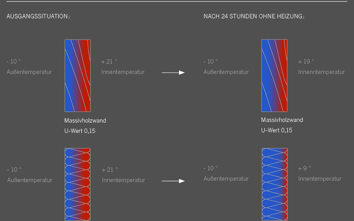 Massivholzhäuser verfügen über eine hohe speicherwirksame Masse. Wärme wird aufgenommen und zeitverzögert wieder abgegeben. Das wirkt sich im Winter wie im Sommer positiv auf das Wohnklima aus.