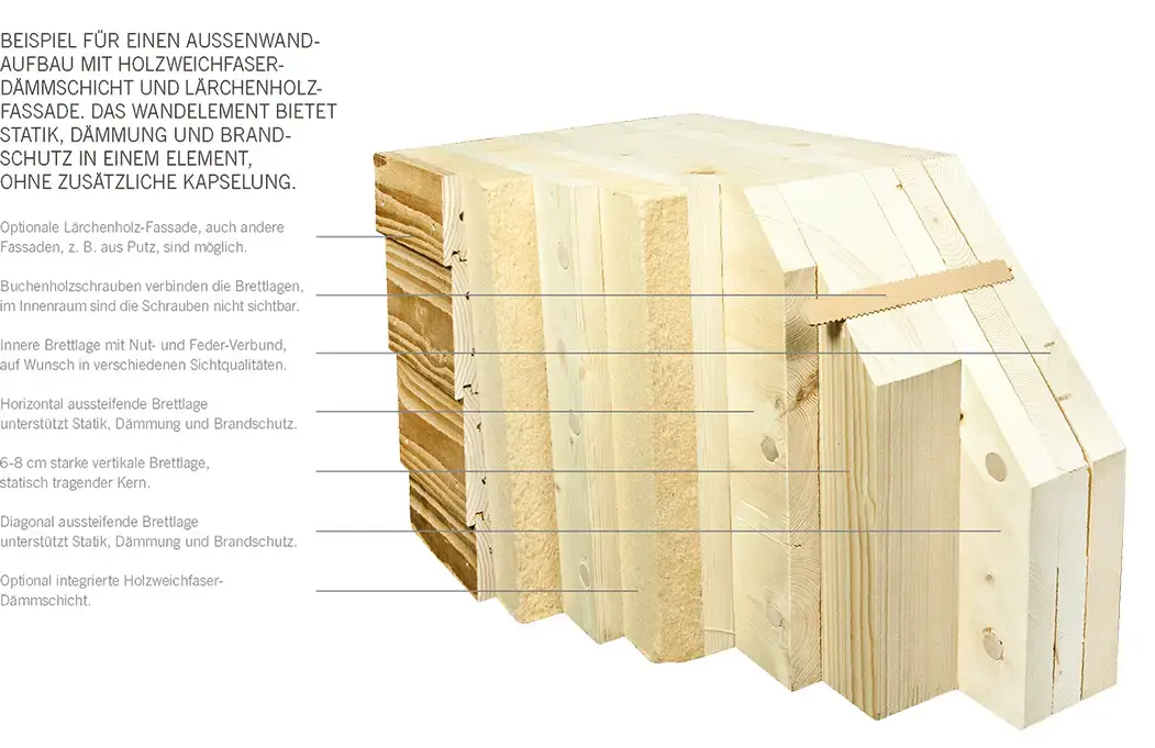 Bei einer Wandstärke von rund 30 Zentimetern erreichen die Bauteile einen Feuerwiderstand von bis zu 140 Minuten. Erst nach längerer Beflammung ist auf der Rückseite eine nennenswerte Temperaturerhöhung messbar. Diese Eigenschaften machen den Massivholzbau auch aus brandschutztechnischer Sicht sicher und zuverlässig.